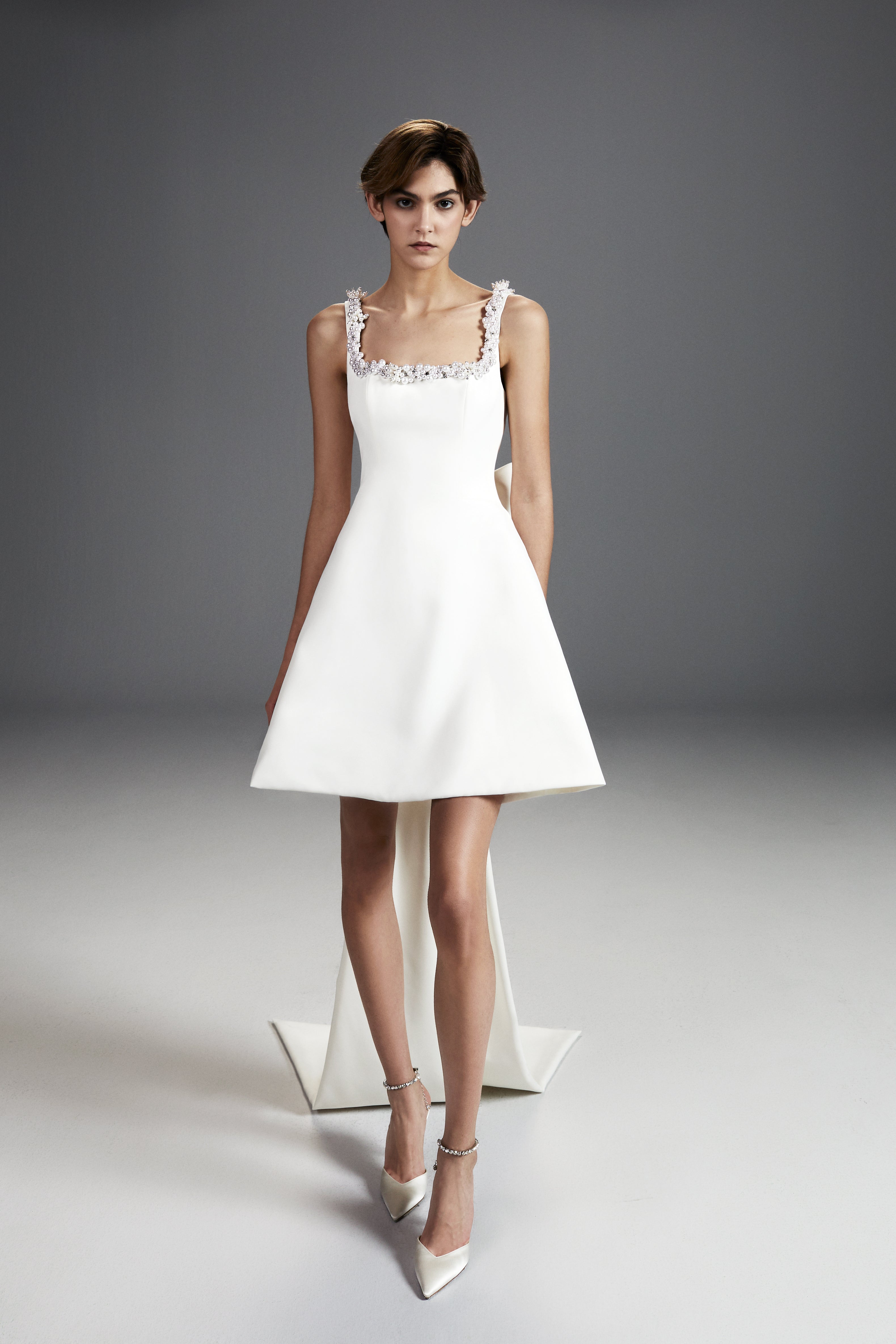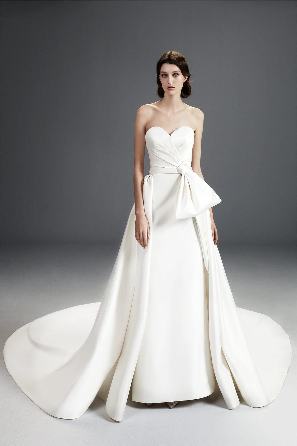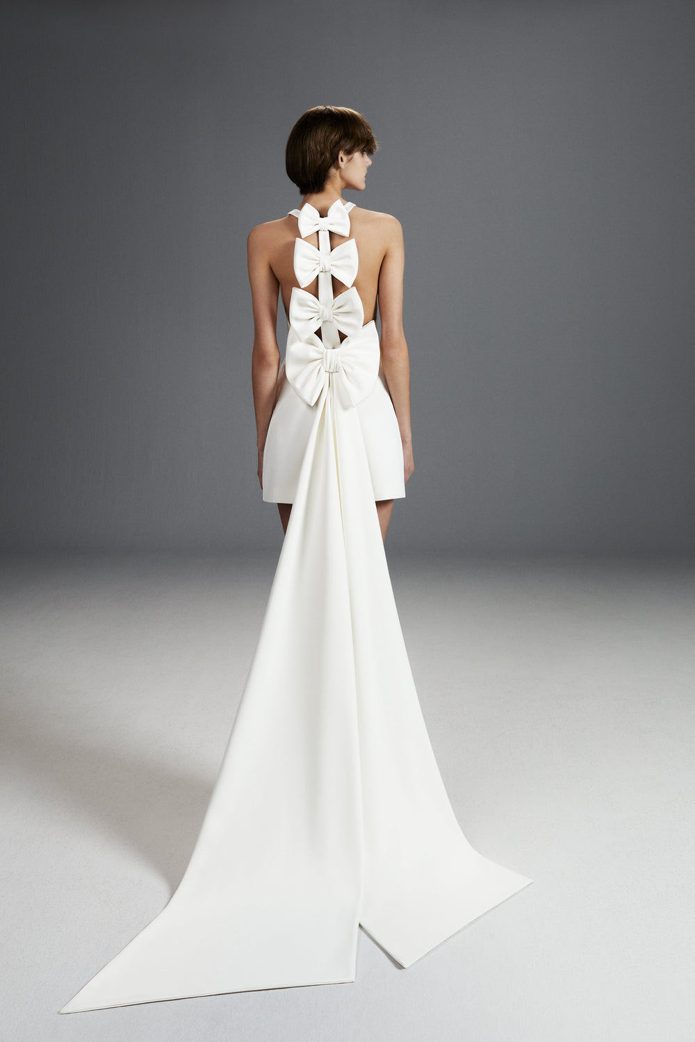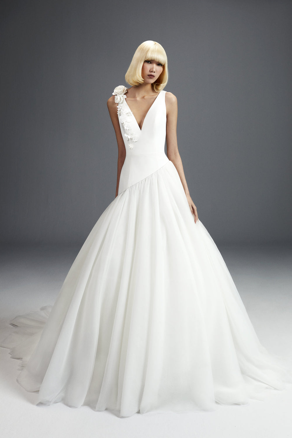 Viktor&Rolf Mariage is a curated bridal collection that merges the house’s avant-garde aesthetic with timeless romance. Across multiple seasons, the designs balance sculptural silhouettes with ethereal details—voluminous ballgowns, sleek mermaids, chic mini dresses, and their signature jumpsuit all appear in luxurious fabrics like mikado, jacquard, charmeuse satin, and shimmering tulle.