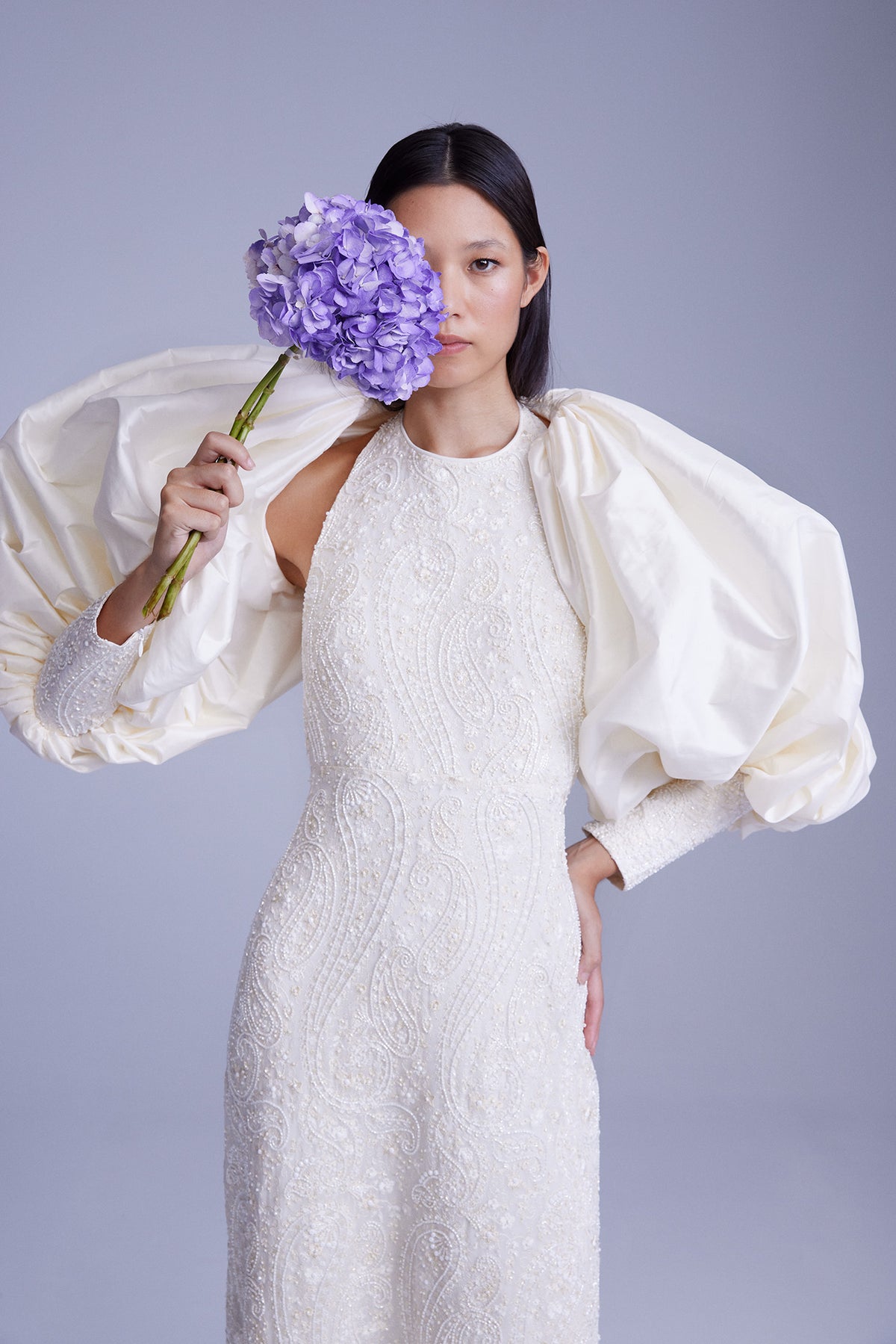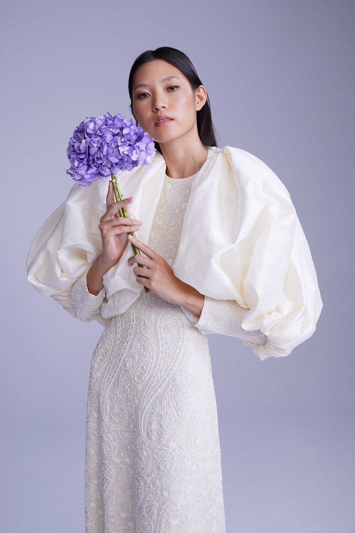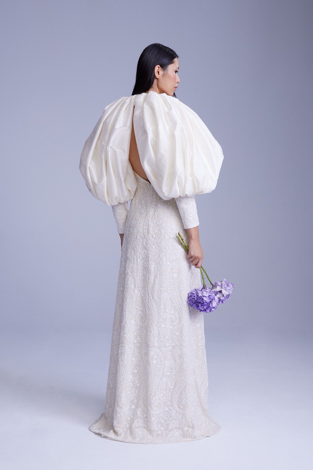 Sale Sold outThe volume of the Helen detachable sleeves are the perfect complement to the Helen dress. The elegance of the sleeves make this look versatile and adaptable to every moment of the celebration. Made of taffeta with crystal beaded cuffs. Fully lined.