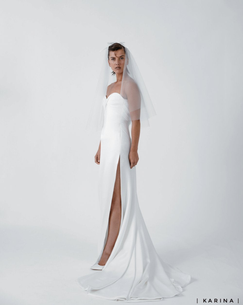 Sale Sold outRounded sweetheart neckline with extended corset. Side seam split opening. Zipper and custom button closure. Train length from waist 180cm. Styled with Karina Tulle Sleeves