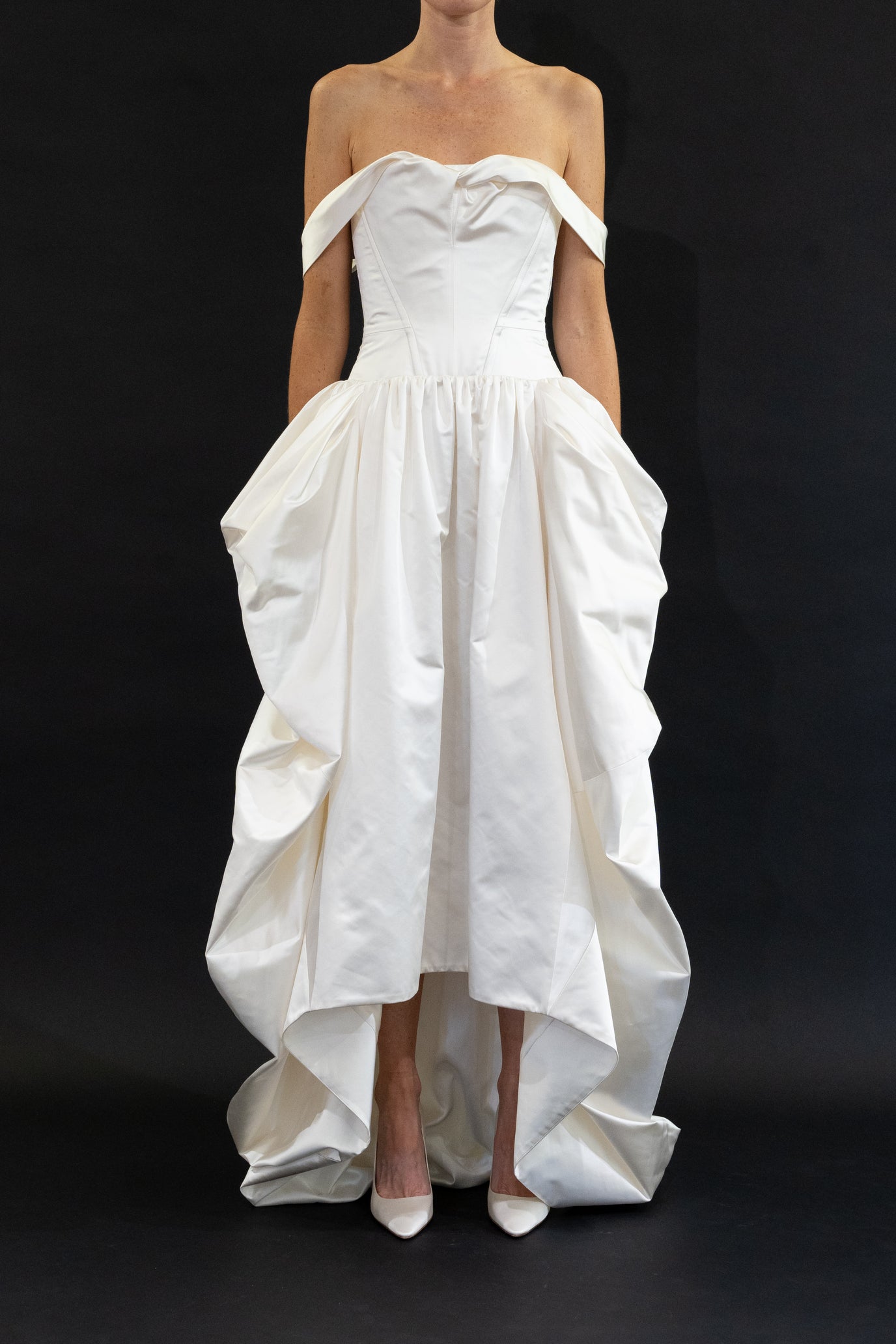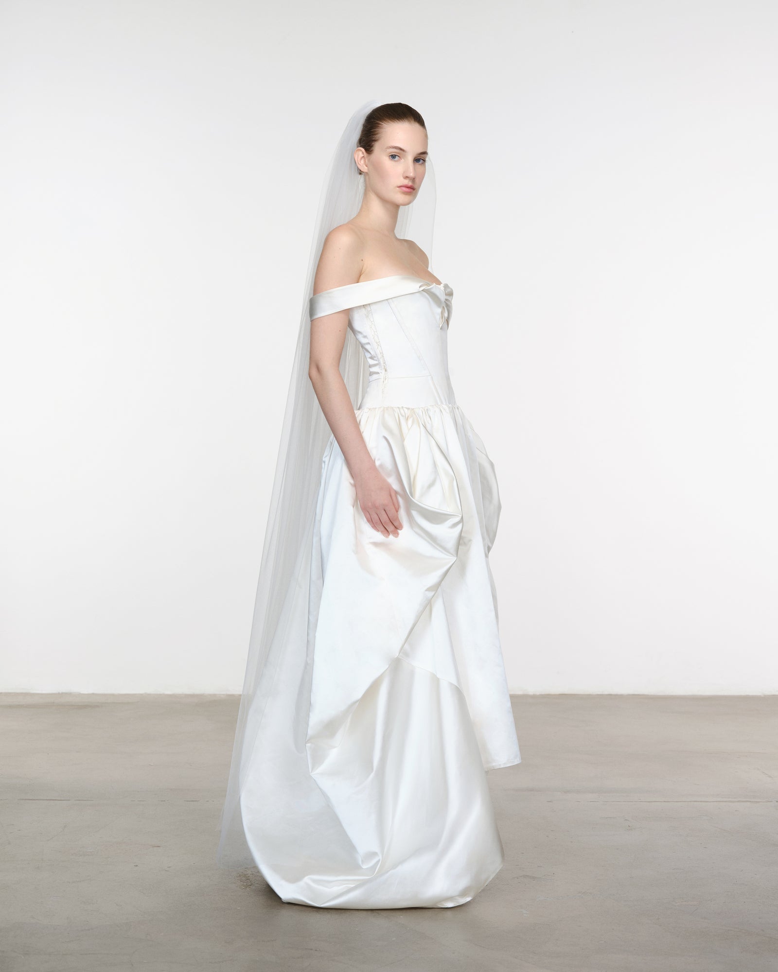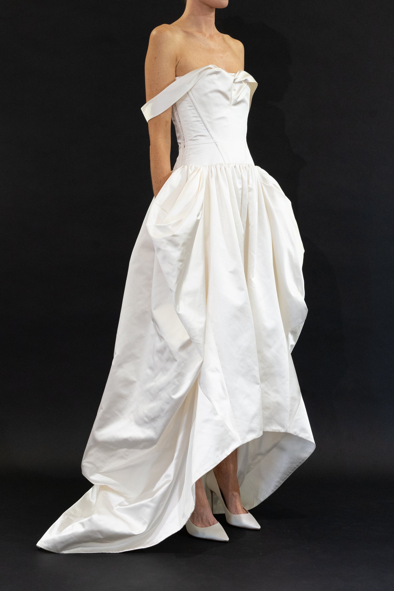 The Ness Dress is a sophisticated, romantic statement crafted with a structured bodice in duchesse satin. Featuring a soft off-shoulder and subtly draped front twist detail. The skirt features signature WED draping imagined in a leaner silhouette.