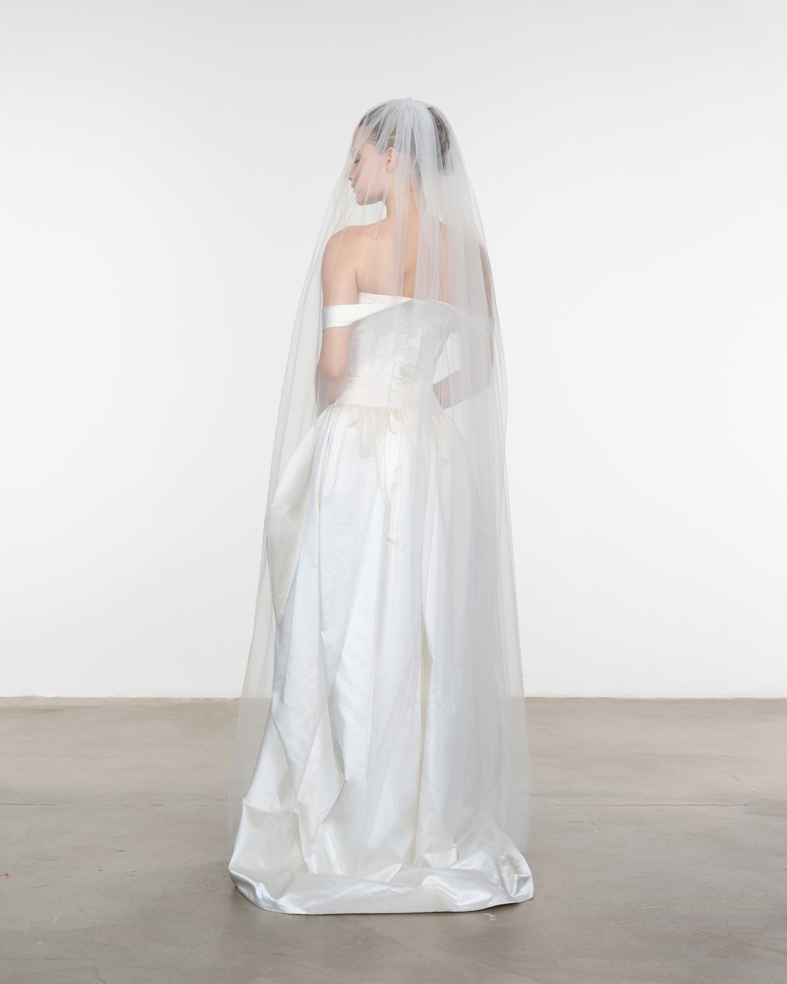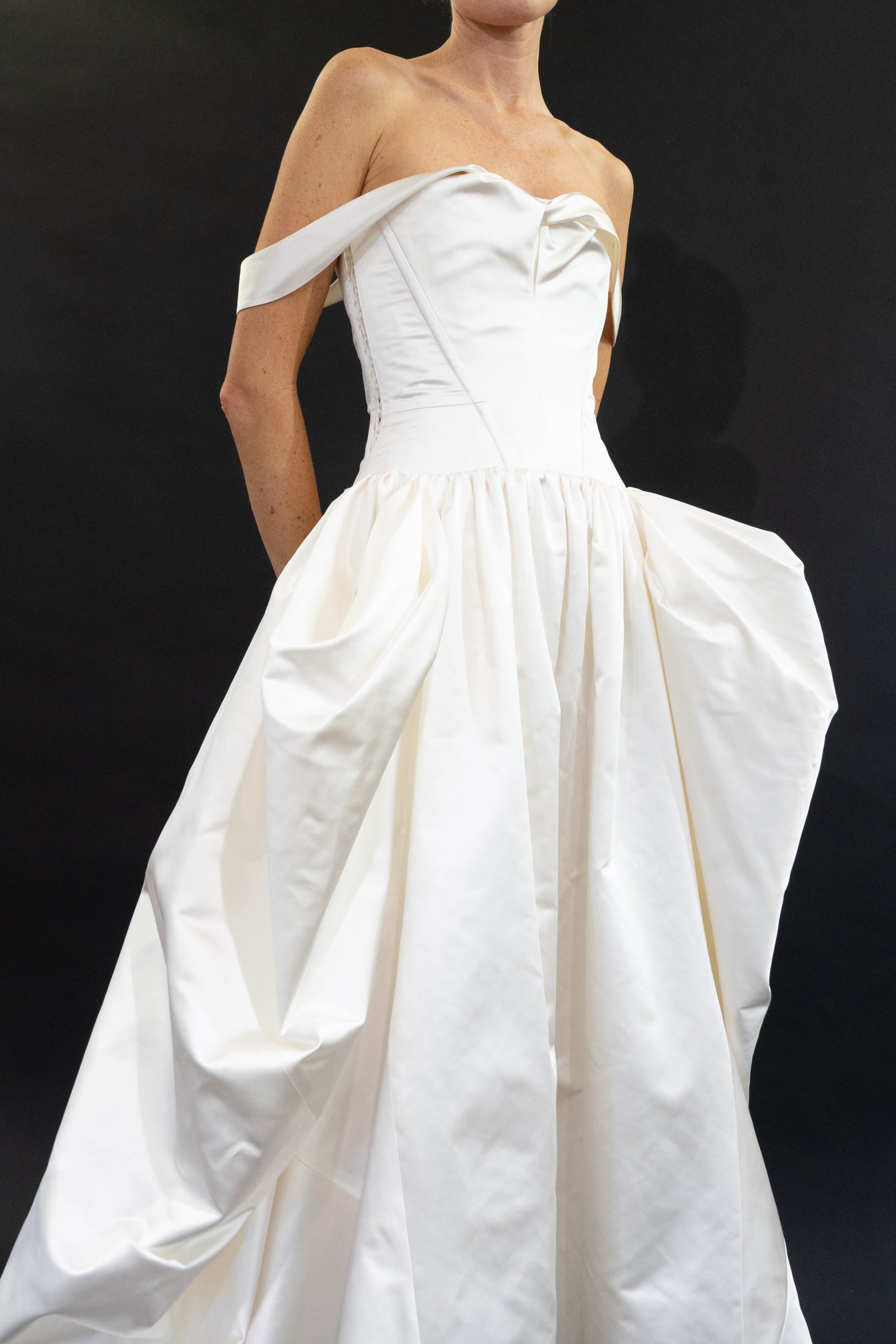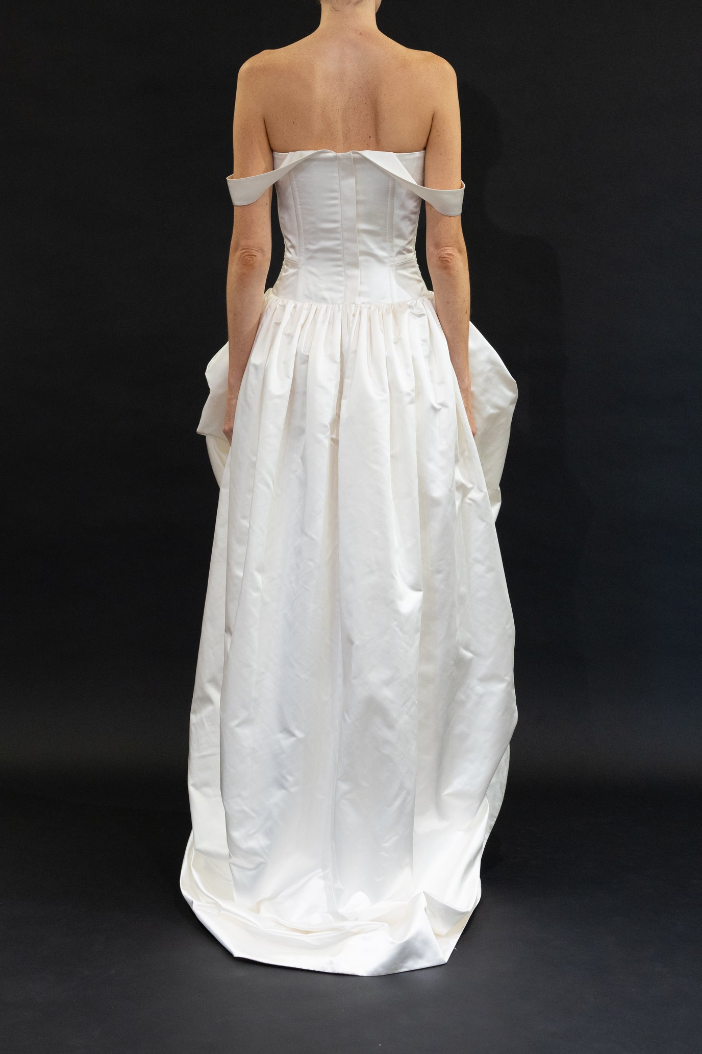 The Ness Dress is a sophisticated, romantic statement crafted with a structured bodice in duchesse satin. Featuring a soft off-shoulder and subtly draped front twist detail. The skirt features signature WED draping imagined in a leaner silhouette.