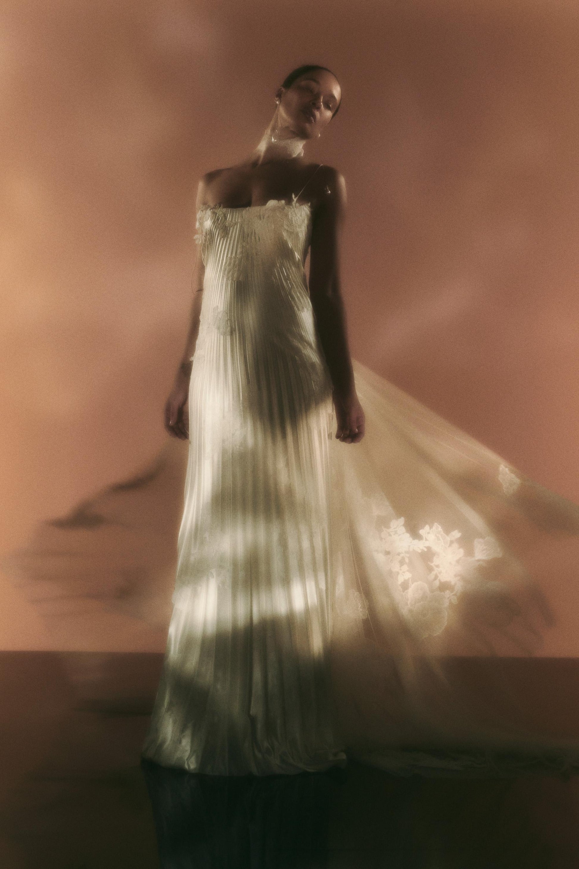 Sale Sold outPleated silk wool column gown with hand appliqué Chantilly and corded lace. Detachable Watteau train pouring down center back. Soft internal bustier with side boning, cups, and grosgrain belt with 3 hook position. Low center back zip, hook and eye closure.