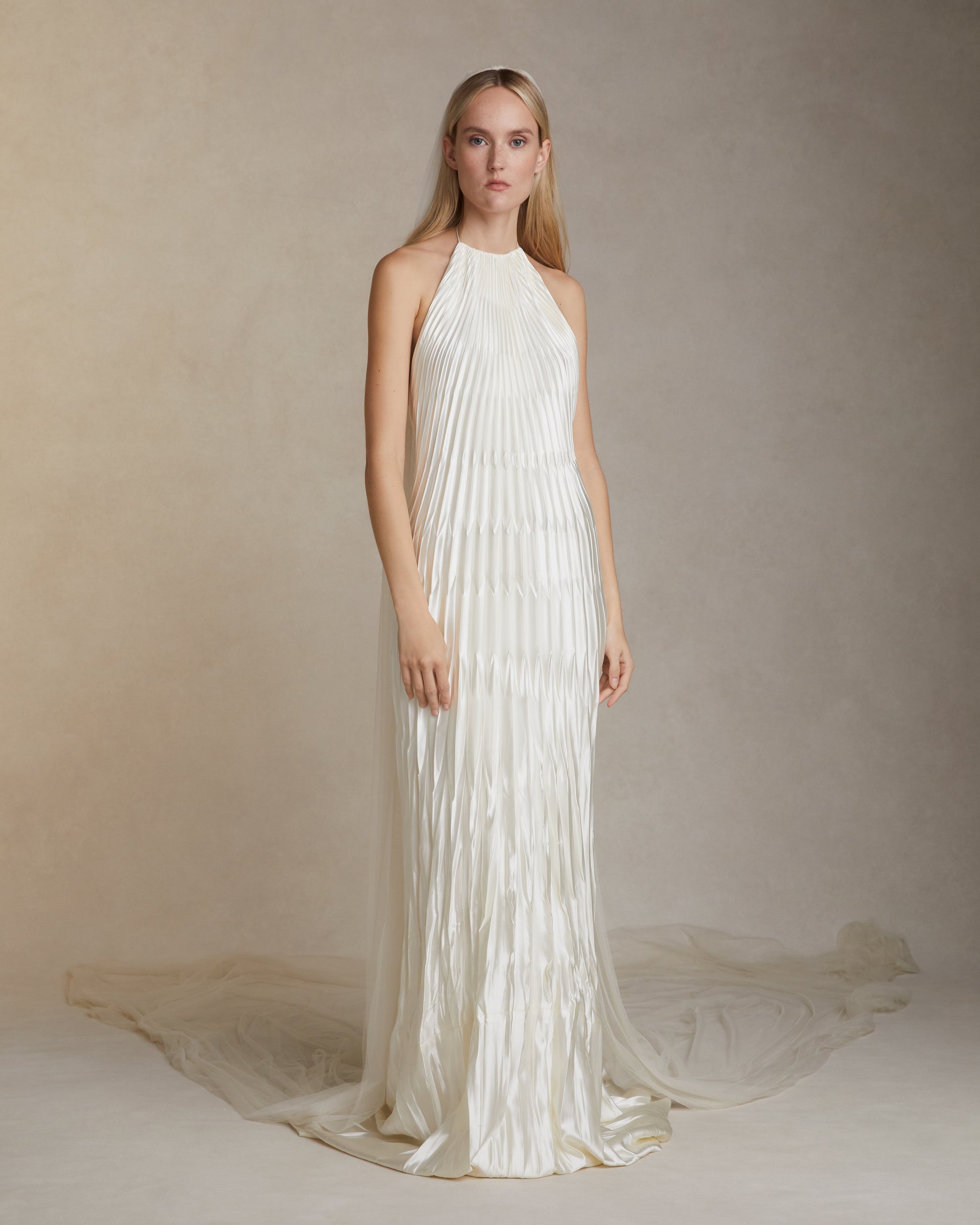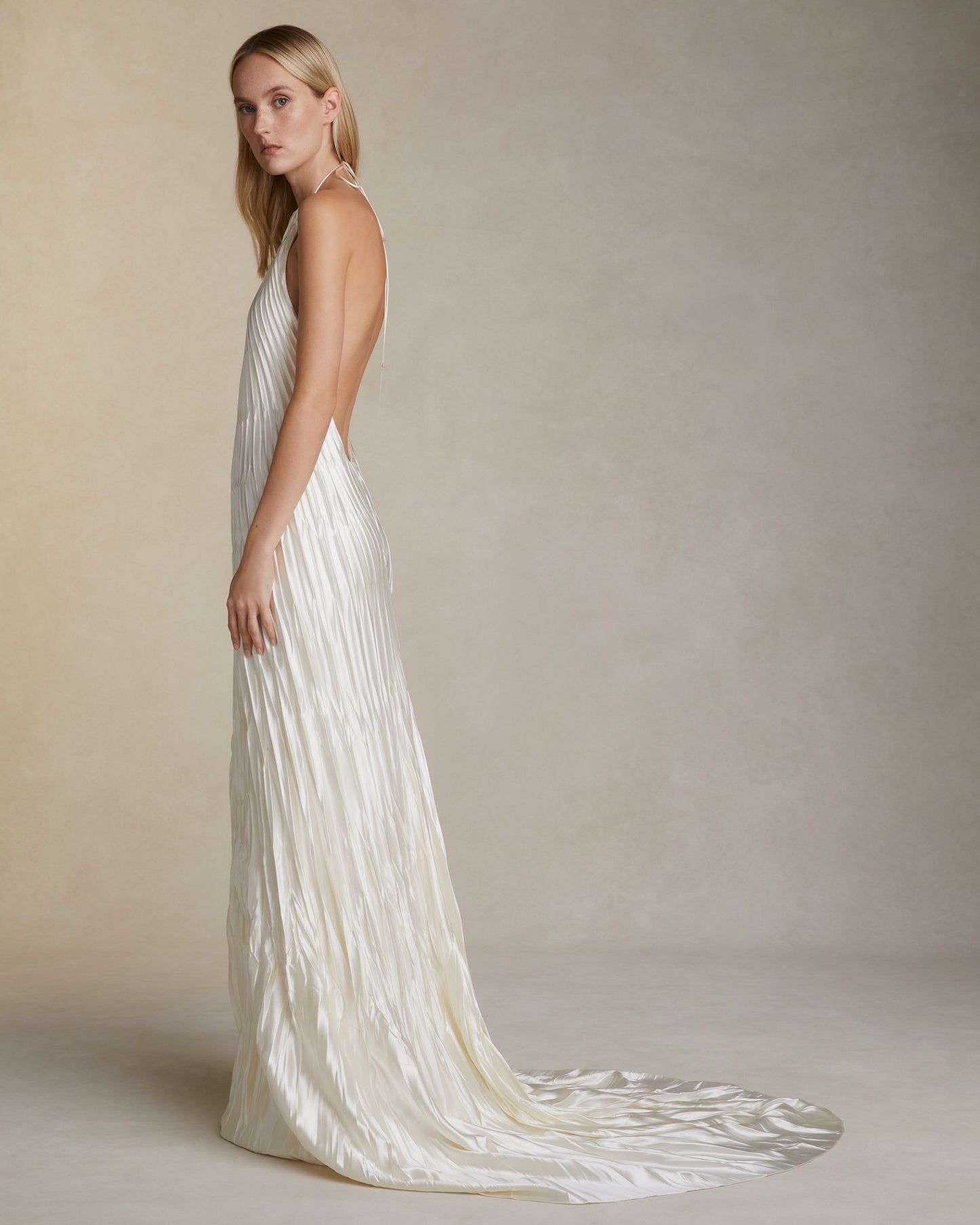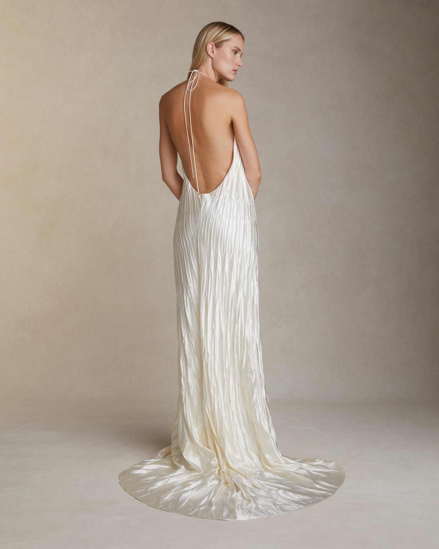 Pleated and hand crinkled silk wool halter neck gown. Spaghetti tie closure with baroque pearl cord end detail. Invisible zip closure at center back.