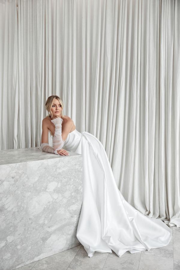 Sale Sold outNew twist on the iconic Chantelle gown featuring flattering draping over the waist cascading into a full skirt with a high split. Fabric: 100% silk faille