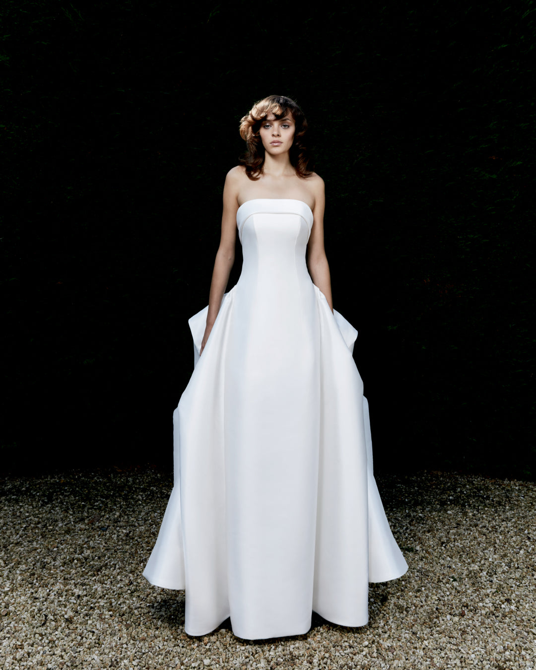 Sale Sold outA straight strapless neckline and graphic band lend a modern look to this column gown made from mikado. The sleek, clean front of the dress contrasts with the dramatic back, where the skirt transforms into a voluminous Victorian-inspired bustle drape, flowing into a long back train.